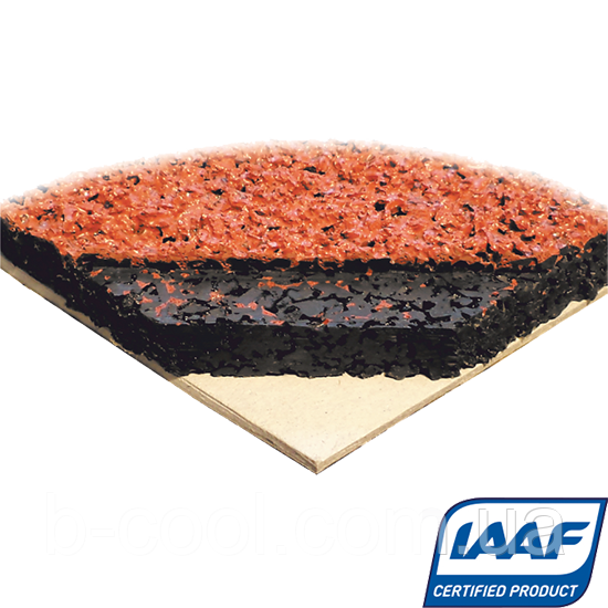 1. Праймер, нанесенный на подготовленное основание (асфальт или бетон) 2. Базовый слой 11 мм, состоящий из резиновой крошки и полиуретанового связующего 3. Финишный слой 2 мм, нанесенный распылением, смесь специального спрей-компонента и EPDM гранул 0,5-1,5 мм |